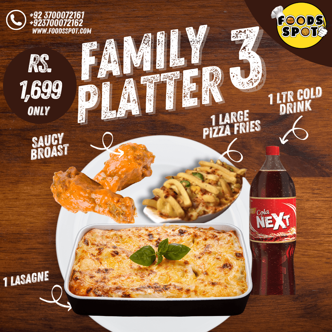 1 Large Pizza Fries + 1 Pasta/Lasagne + 1 Saucy Broast + 1 Ltr Cold Drink